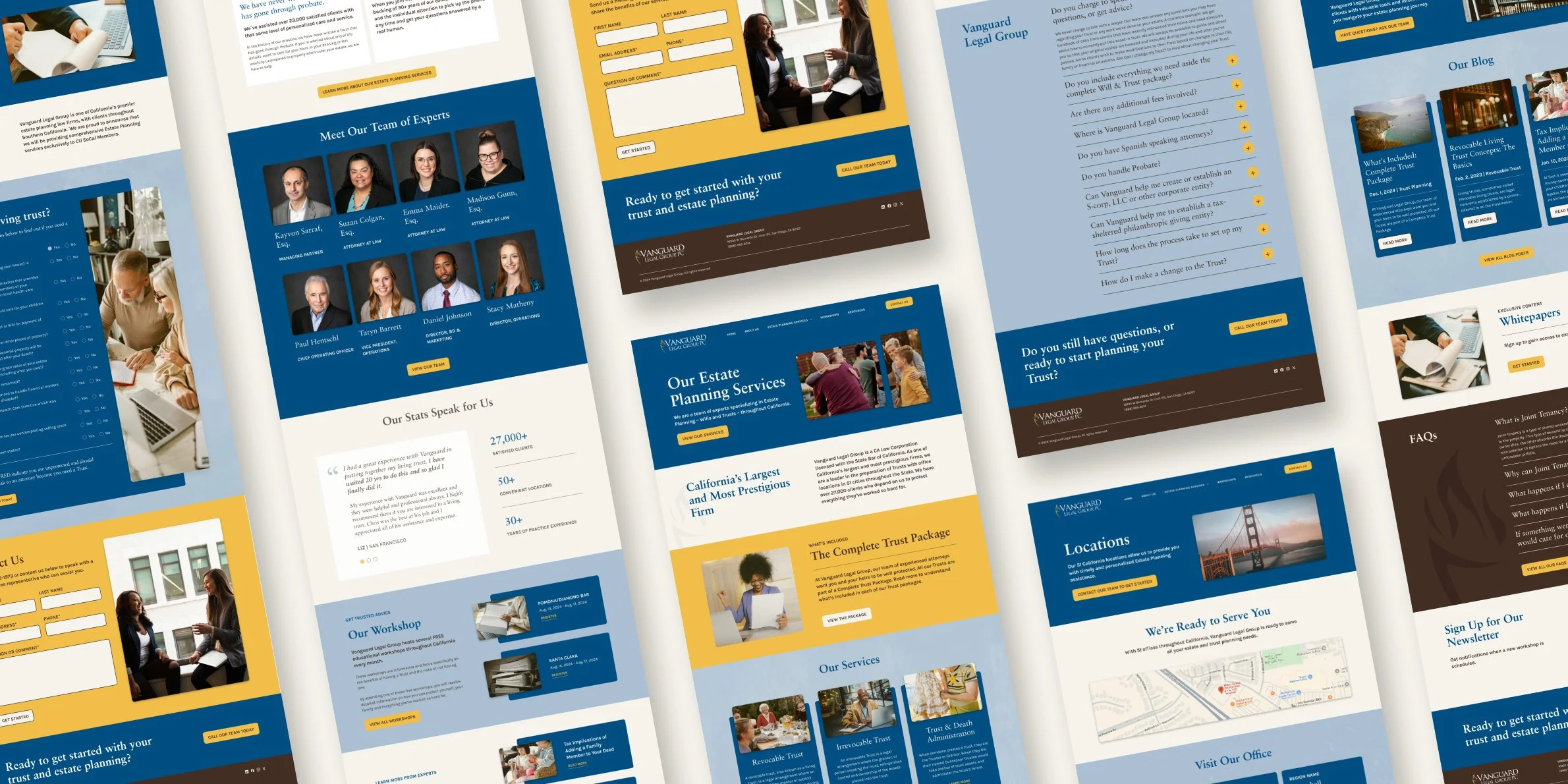 Due to the nature of their industry and focus on estate planning, our design choices were made with the intention of softening harsher edges and relaying a trustworthy partner. The headline font is sophisticated and readable. The images are treated with a slight round border. The photo treatment relies on warmer tones to complement the cool primary color.